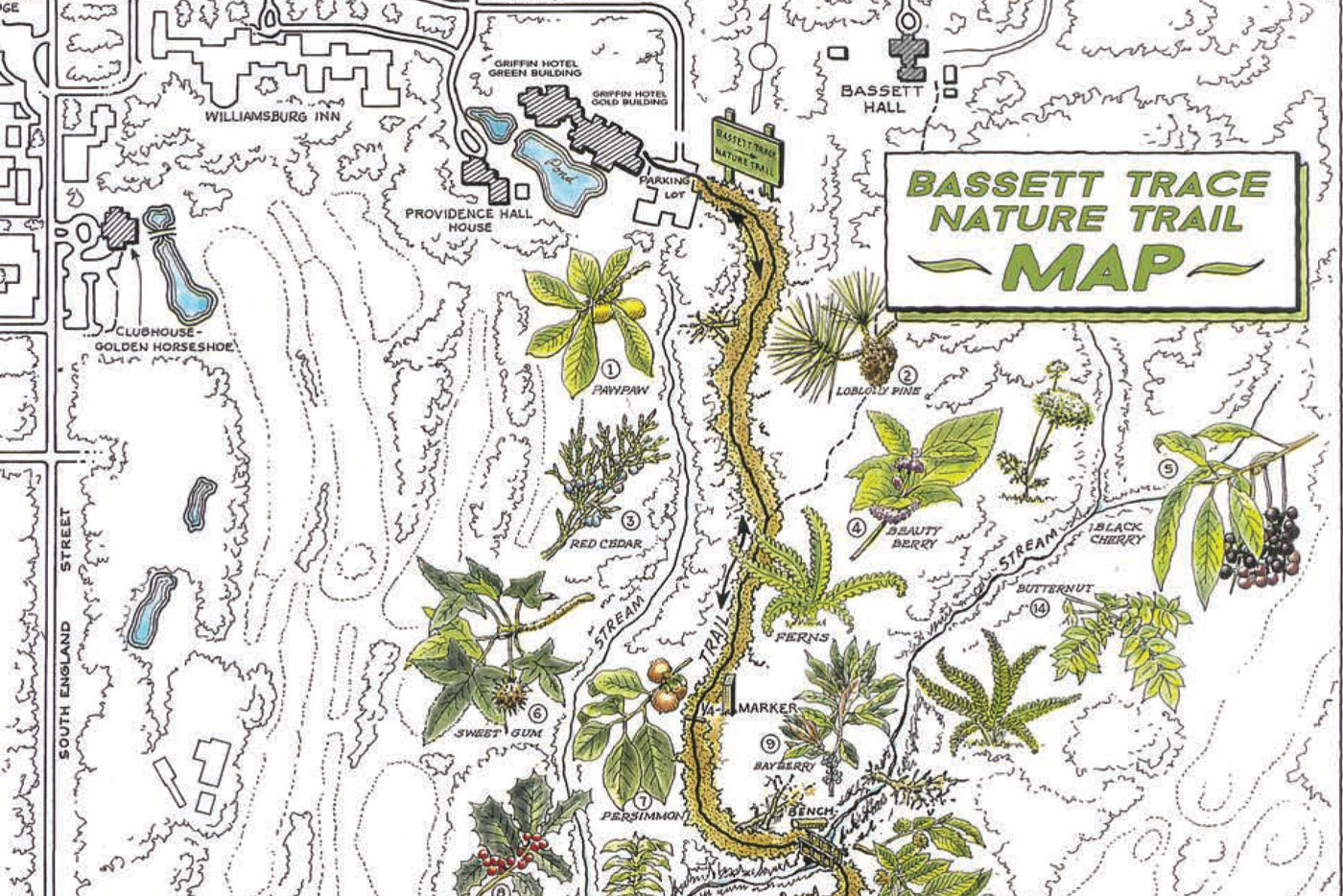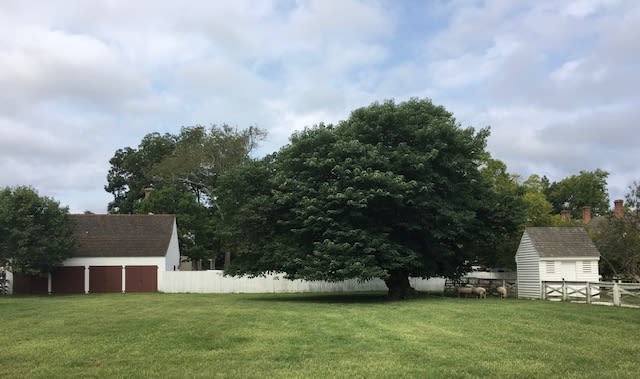 The long arbors on both sides of the Governor’s Palace north garden are made of the American beech. A long-lived native tree, the American beech provides shelter and food for many mammals and birds. Passenger pigeons, before their extinction, were among those species that ate the brown 3-angled nut.